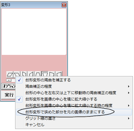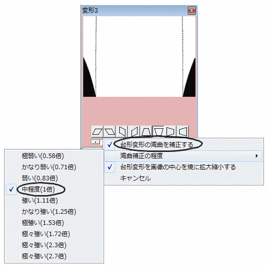 台形変形の強度をプラスにすると変形の方向に縮み強度をマイナスにすると変形の方向に間延びします。つまり画像の縦横比が変わってしまいます。台形変形で縦横比を変えないためには下図のようにウインドウの右クリックメニュの「台形変形を画像の中心を境に拡大縮小する」をチェックするとこの縮んだり間延びしたりが大幅に緩和されます。