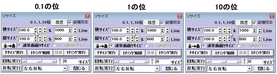 □印の部分の縦と横のスピンボタンには夫々一回ボタンを押すごとに10の位づつや1の位、0.1の位づつ変化する3つのボタンを使って細かく設定することができます。