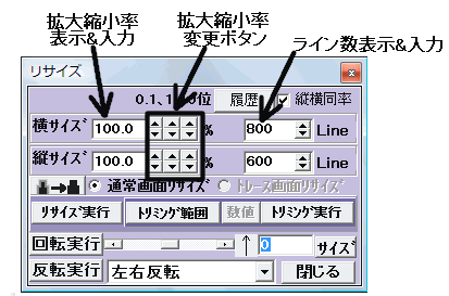 リサイズを行うには下図のコンポ−ネントで縮小率や画像の最終ライン数を設定してから実行します。