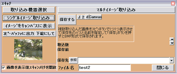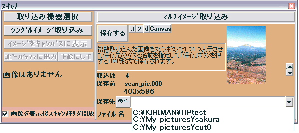 「マルチイメージ取り込み」を押すと接続されたスキャナーの取り込み画面になりますのでそこで複数の画像を枚取り込みますそしてその後に接続されたスキャナーの取り込み画面を閉じます。そうすると下図の右側のように画像のサムネイル画像が表示されます、この画像はスピンボタンを押して切り替えることができます。取り込んだ複数の画像は「scan_pic000,scan_pic001 scan_pic008」のように連番の名前が付けられインストールフォルダに保存されていますこれを名前を変えて保存先と書かれている部分に入力されたパス(場所)に保存し直します。保存先と書かれている部分に保存先のパスを入力してその下の部分のエディットコンポに新しい名前を入力してから「保存」のボタンを押して保存し直します。この操作を画像を切り替えながら取り込んだ画像を全て保存してください。