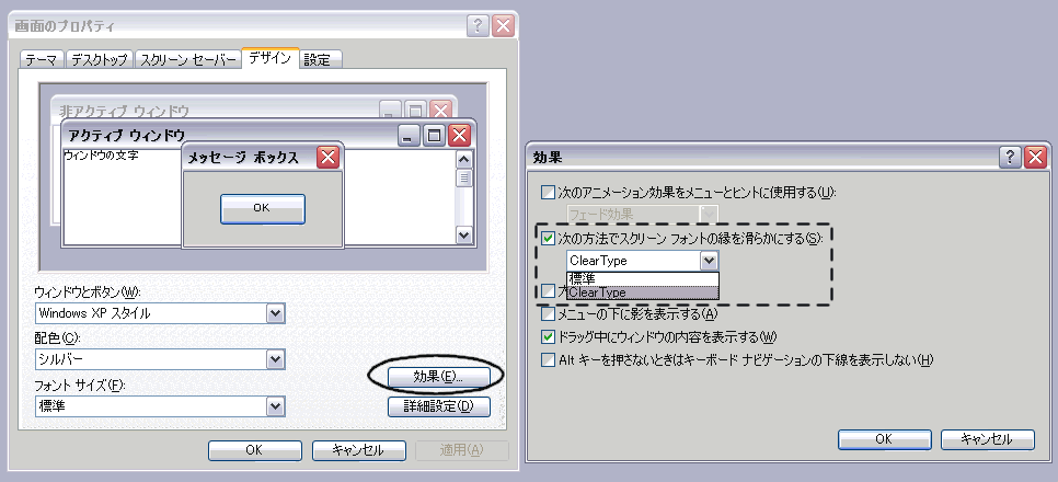 Windowsのスクリーンフォントの設定が少なからず文字出力機能へ影響を与えます、画面のプロパティの「効果」ボタンを押して表示されたダイアログの「次の方法でスクリーンフォントの縁を滑らかにする(S)」の設定がHyper-Paintの文字機能の文字の滑らかさにも影響を与えます。