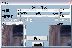 下図は実行してピントを上げた画像です。なおシャープフィルタは「輪郭値」のスクロ−ルバーを調整することによって画像の輪郭部分のみのピントを上げるようにして輪郭以外の処理はしないようにして画像の荒れを最小限にすることが出来ます。詳しくはこちらを参照下さい。
