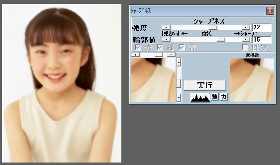 シャープフィルタで画像のピント(フォーカス)を上げるには下図のように「強度」のスクロールバーを右に動かします、プレビュの画像を見ながらちょうど良いように調整して実行ボタンを押して変換します。