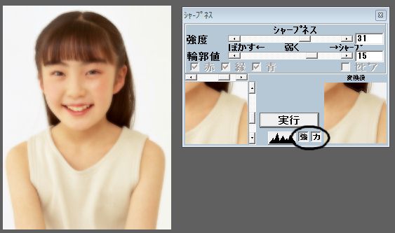 だいたいこのぼやけ具合の場合は強度 26 以上の 31 にして補正すると下図 の○印のボタンが自動的に押し下げられ大きくぼやけた画像の補正モードになります。