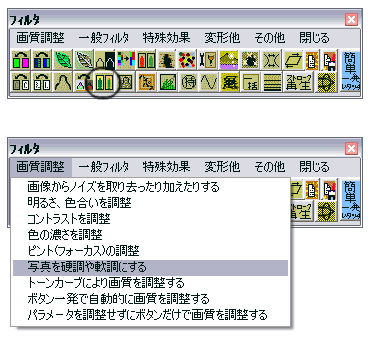 一つ目は「硬調軟調」フィルタを使う方法です、まだデジタルレタッチなどない時代の銀塩カメラの時代にも現像のしかたで硬調や軟調に仕上げることはありました、この「硬調軟調」フィルタは銀塩カメラ時代のこの現像のしかたを再現するものです下図のようなフィルタ選択ウインドウの○印のボタンを押して表示するかフィルタ選択ウインドウのメニュから呼び出します。