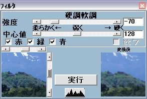「硬調軟調」フィルタの強度を-70にして実行します、このフィルタは強度をマイナスにすると軟調に加工しますちなみにプラスにすると硬調に加工します。