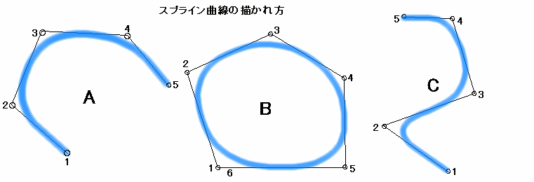 Bの場合1〜5の地点を指定し最後の6は1と同じ地点を指定し閉じた図形を指定すると図のように各地点を結ぶ直線に内接するように閉じた曲線がえがかれます。