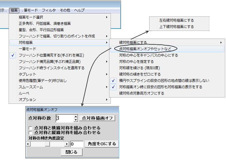 ちょっとした注意として点対称描画の目安の図形表示において2点とか4点、6点などの偶数の点対称の場合に同時に横線対称と縦線対称を組み合わせていると目安の図形が表示されないということがありました