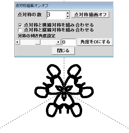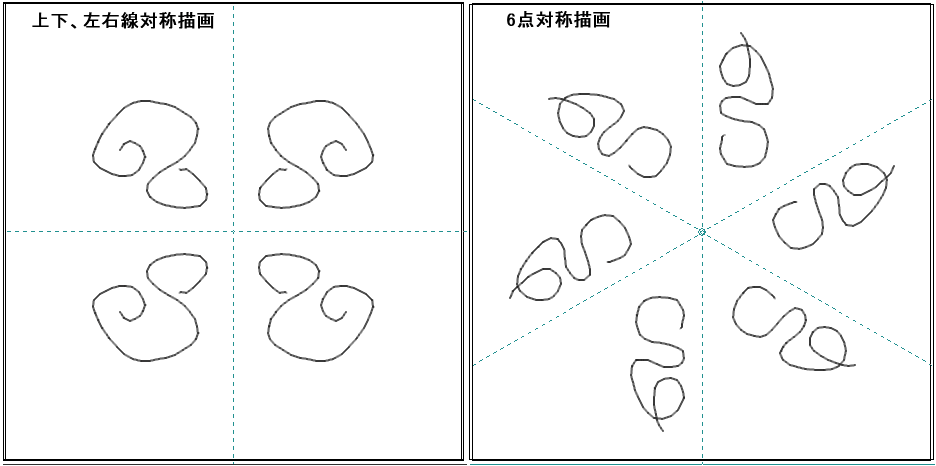 点対称描画では「点対称と横線対称を組み合わせる」のチェックボックスをチェックするかしないかで下図のように変わります。