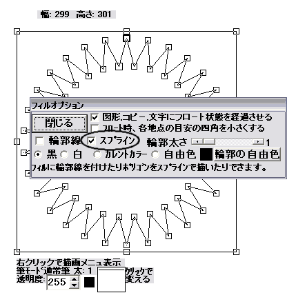そうするとフィルダイアログが表示されますので下図の○印の「スプライン」のチェックボックスをチェックして図形をスプラインで表示します。