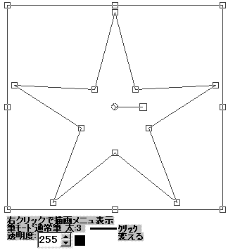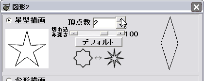 下図のようなダイアログが表示されます、星型の描画をする場合は「星型描画」のラジオボタンをチェックしてエディットコンポに描く星型の頂点の数を入力します、台形を描く場合は「台形描画」のラジオボタンをチェックして描く台形の上辺と下辺の長さ(ピクセル)をエディットコンポに入力します、設定が終了したら「描画」のボタンを押して実行します。なお描画モードがポリゴンモードに自動的に切り替わりますので注意願います。(切り替わる前にその旨を知らせるメッセージダイアログが表示される)