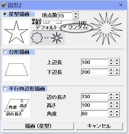 星型描画は各位置をランダムに作成する「ランダム」のチェックボックスをチェックすることで漫画などによく使われる効果を作成描画することができます。