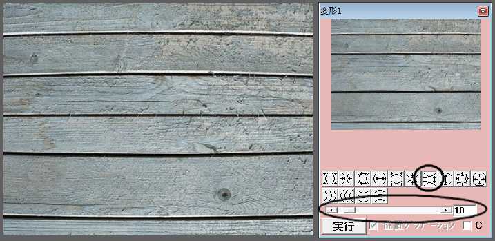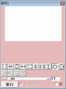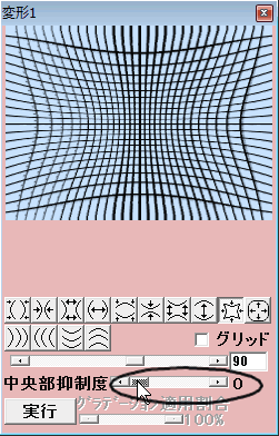 そうすると下図のようなウインドウが表示されますので変形の種類のボタンを押し下げて選択して強度を設定して実行ボタンを押して適用します。