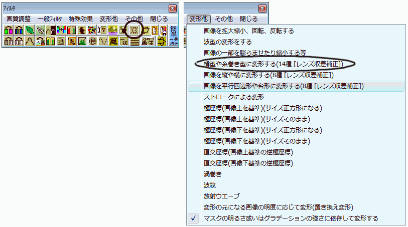 樽型、糸巻き型変形はフィルタ選択ウインドウの○印のボタンを押すか或いはメニュの「樽型や糸巻き型に変形する(14種[レンズ収差補正])をクリックします。