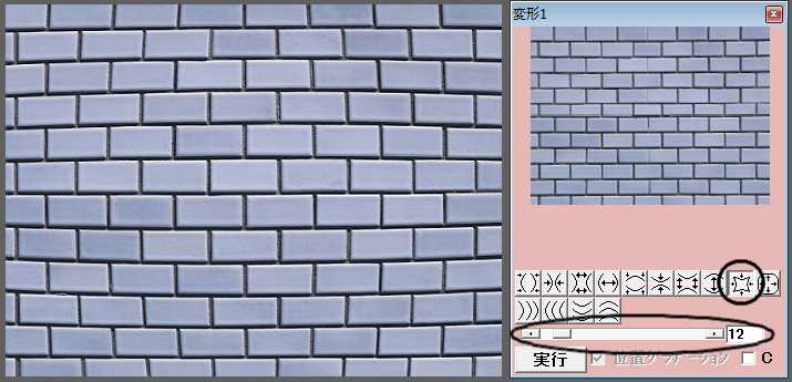 修正しようとしている画像は中央から膨らんでいますので下図右のように○印のボタンを押し下げてプレビュを見て確認しながら強度を 12 に設定して実行します。