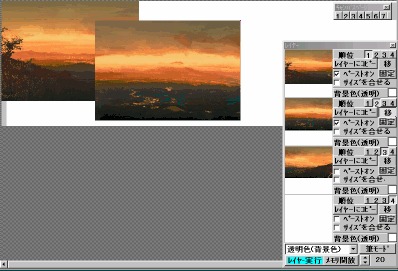 今回はレイヤ−を使って行ってみますのでまず3枚の画像を接続しても十分余裕がある大きさのキャンバスを「白紙」で作成しておきます。次ぎにレイヤウインドウを開き、「レイヤ−にコピ」ボタンを押してファイルから4つあるレイヤ−にそれぞれ画像を読みこんでおきます。