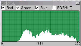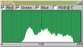 ヒストグラムは通常上図のような曲線で表され曲線は画像の中に各RGBの0から255までの各値の点がどのくらいの頻度で現れているかを表しています。