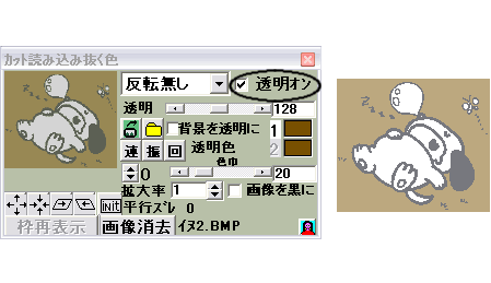 不定形コピー画像を透明に貼り付けるには下図のようにウインドウの「透明オン」のチェックボックスをチェックします、このとき貼り付ける画像の透明度はパレットの透明度が適用されます、ウインドウの「透」のスクロールバーでも指定できます。