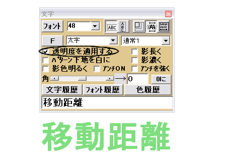 文字を透明に貼り付けるには下図のようにウインドウの「透明度を適用する」のチェックボックスをチェックします、このとき貼り付ける画像の透明度はパレットの透明度が適用されます。