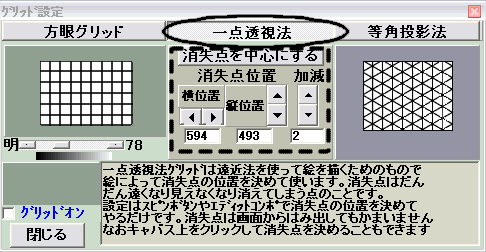 グリッド設定ウインドウが表示されたら○印の「一点透視法」のボタンを押します、消失点を設定するには下図のスピンボタンを押して位置を設定するか或いはキャンバス上をクリックすることによって設定することが出来ます。