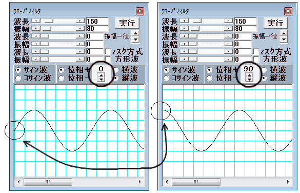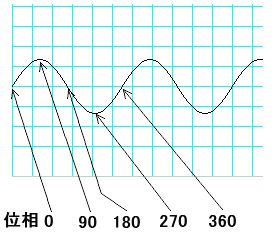 下図のように位相の部分の○印の部分で位相(0〜359度)の値を変えることができます。この値は波の始まる角度です。