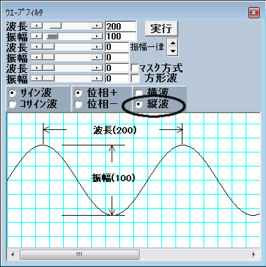 ウエーブフィルタは下図のようになっています。波の設定は主に「波長」と「振幅」の数値をスクロールバーで変えることによって行います。そうするとウインドウの下側に波形が表示されます。